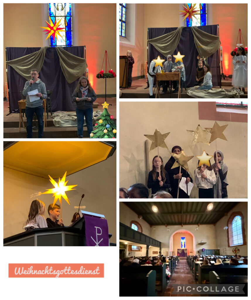 Ein besonderer Höhepunkt war der Weihnachtsgottesdienst am vorletzten Schultag. Zunächst feierten die Erst- und Zweitklässler, anschließend die Dritt- und Viertklässler. Frau Schäfer hatte mit ihrer Arbeitsgemeinschaft ein wunderschönes Krippenspiel einstudiert. Gemeinsam mit den Kindern der AG, dem Gemeindepädagogen Peter Kissel und mit musikalischer Begleitung von Herrn Scharf wurde ein stimmungsvoller Gottesdienst gefeiert – ein sehr schöner Abschluss der Vorweihnachtszeit.